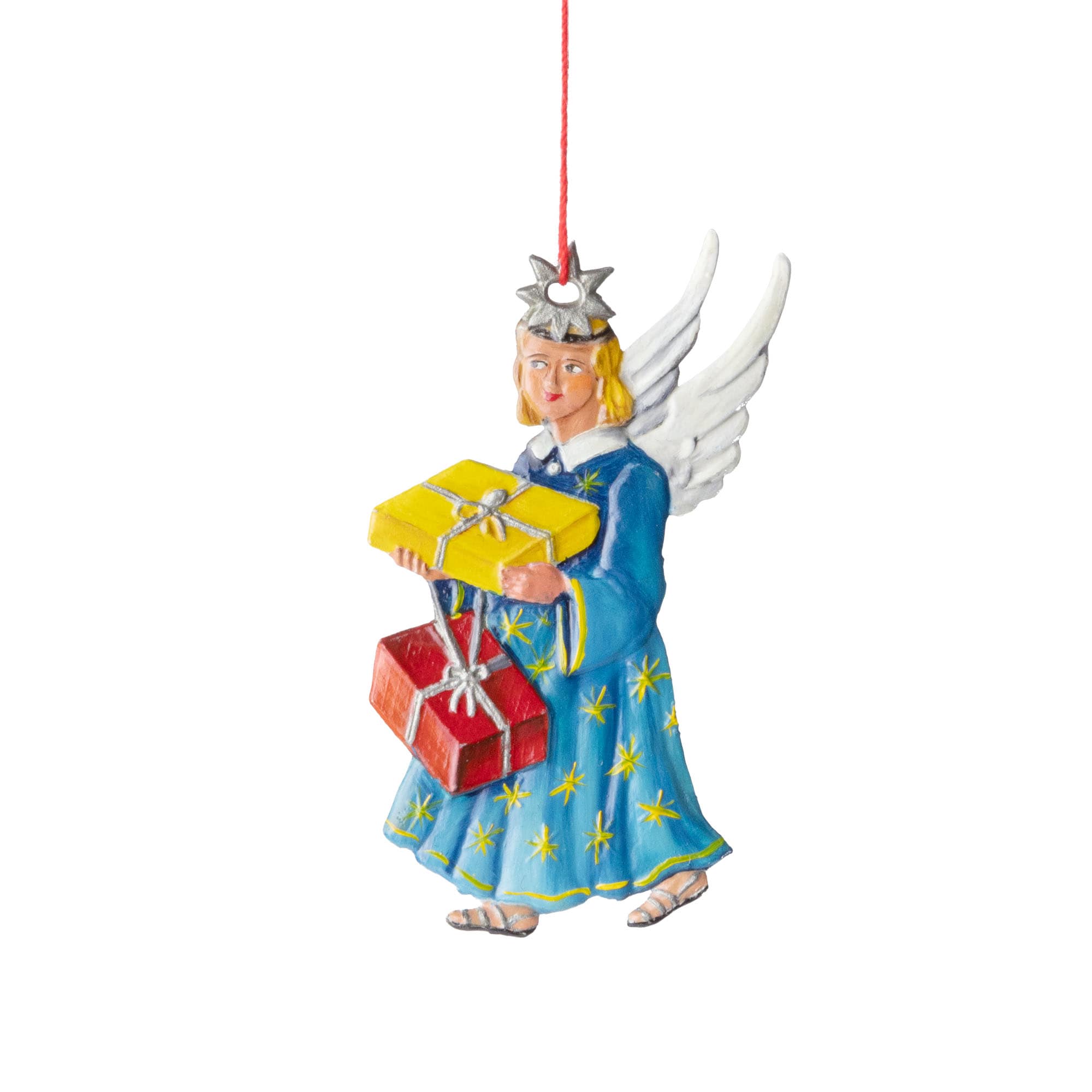 Dieser farbenfrohe Sterntaler-Engel aus Zinn mitsamt seinen Packerl wird von Peter-Ewald Kovar in seiner Zinngießer-Werkstatt in Wien in traditioneller Handwerkskunst angefertigt.